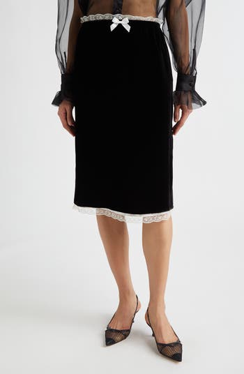 This plush slip skirt fashioned from silk-enhanced velvet is accented with the designer's signature lace trim along the hem and waistline and finished with a delicate ivory bow at the center.