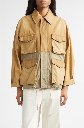 Designed with a beige and tan patchwork effect, this cotton canvas and twill workwear jacket features rolled cuffs and roomy bellows pockets for a retro utility aesthetic. A braided drawstring cinches the hem, while a heavy wash and gradient spray treatment bring the label's signature worn-in and weathered effect.