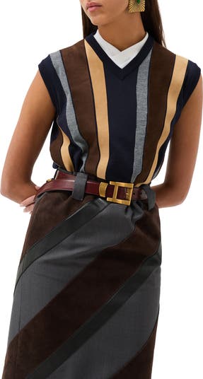 From Dario Vitale’s debut collection for Versace, this runway-featured sweater-vest nods to Gianni Versace’s late-’80s codes through precise patchwork. Soft, wool-forward knit panels collide with buttery suede in clean vertical blocks, and ribbed trim keeps the shape neat and close. An embroidered logo at the nape seals it with quiet icon status.