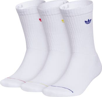 Colorful trefoil logos detail the cuffs of these softly ribbed crew socks coming in a convenient pack of three.