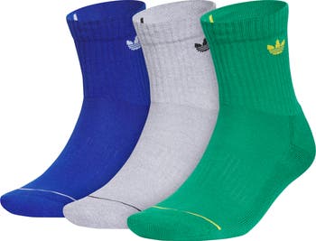 Signature Trefoil logos bring casual flair to these gym-to-couch crew socks made with stretchy ribbing.