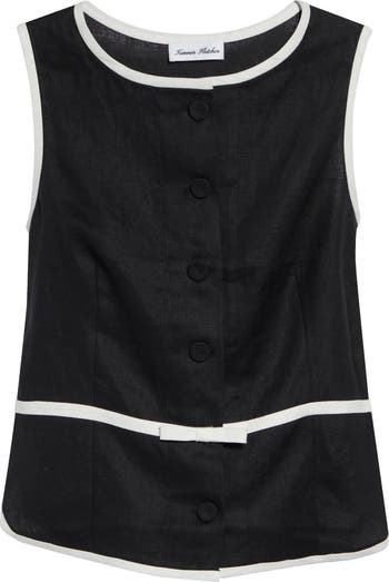 This crisp linen top is designed as a classic sleeveless shell shaped with a ballet neck and edged with contrast binding centered by a neat, flat bow at the waist.