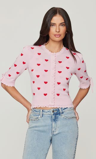 The Tess Hearts Intarsia Cardigan combines playful charm with cozy comfort. With its relaxed fit, soft knit texture, and allover red heart patterning, it strikes a sweet yet elevated balance. The pink base adds a bright, romantic touch, making it a standout seasonal layer. 65% Viscose, 35% Nylon Unlined Professional Dry Clean Style is Running Big, Recommend Sizing Down for Slim fit Dome Buttons Length: 20 1/2", Sleeve Length: 11 1/4" Model Size & Fit Model wears: US 2/XS / UK 6 / EU 34 Model's height: 5'10″ / 178cm