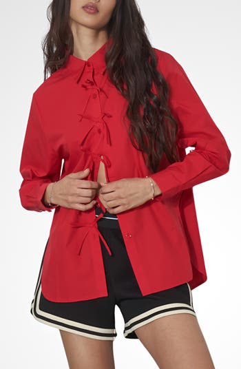 Dainty ties on the placket give a feminine twist to this clean-cut button-up shirt that has curved side slits for added interest.