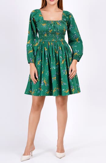 - Machine wash cold, tumble dry low. Do not bleach, cool iron if needed. Organic Cotton Poplin: 95% Organic Cotton, 5% Lycra. Pull-over style. Pockets at side seam. Above-the-knee mini length hemline. Square Neck. Long sleeve. Blouson sleeve. Smocked stretch waist. Fit is true to size.