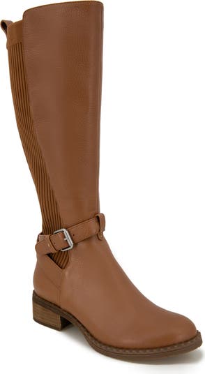 A well-cushioned footbed adds all-day ease to a knee-high boot embellished with a moto-chic buckle strap.