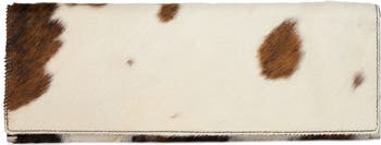 A slender profile creates modern sophistication on a trend-right clutch rendered in cow-patterned genuine calf hair for exotic texture.