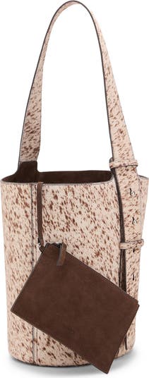 Subtle hardware and genuine calf hair highlight the clean lines and structured profile of a voluminous bucket bag featuring an adjustable shoulder strap and removable zip pouch for on-the-go convenience.