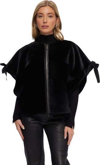 This collarless jacket features soft Genuine Shearling and short sleeves, offering a modern silhouette that balances lightweight warmth with effortless style.