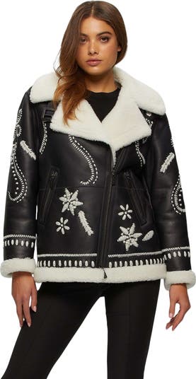 Soft Genuine Shearling is elevated by intricate wool embroidery, creating a zip jacket that blends tactile warmth with artistic, refined detailing.