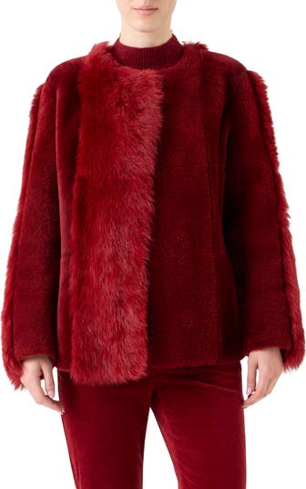 A dimensional patchwork of long and short shearling panels makes this cranberry-hued jacket a statement piece you'll reach for constantly.