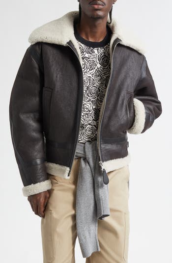 Plush lamb fur at the collar and lining brings a cozy element to this vintage-inspired bomber jacket detailed with 'couture' seams that create a cocoon-like silhouette.