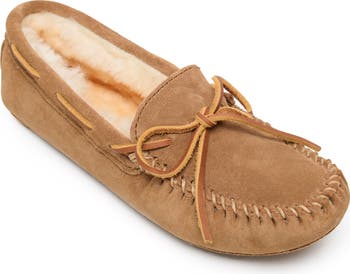 Supersoft shearling floods the cozy interior of this wider-cut slipper crafted from supple suede with whipstitched details.