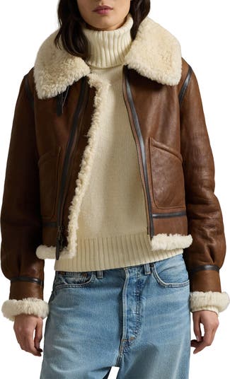 Paneled leather construction distinguishes an aviator jacket crafted in Italy with plush genuine-shearling trim that amplifies your warmth while taking your cold-weather look up a notch.