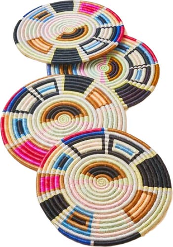 Our favorite Geo Form design now in a set of 4 placemats! This classic piece makes for a unique table setting for your indoor and outdoor dining. Our placemats are handcrafted in Rwanda with a time-honored weaving technique passed down from generations of artisans. 12" Diameter Set of 4 Multicolored Hand-dyed sisal fibers wrapped around bunches of sweetgrass Includes a loop on the back for easy hanging The ideal housewarming gift and the perfect material for both outdoor and indoor dining, the Geo Form Placemats add a nice touch to any tabletop! *Due to the handmade quality, some size and color variation may occur.