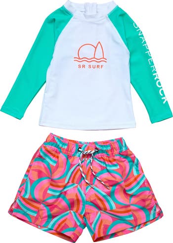 Get baby ready for a day of fun in the sun with this two-piece swimsuit that pairs a UV-blocking long-sleeve rashguard paired with coordinating trunks.