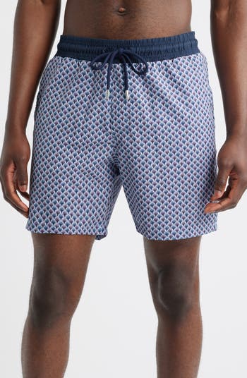 A geometric palm print adds pool-ready intrigue to these stretchy swim trunks outfitted with plenty of pockets and an ultrathin mesh liner for enhanced comfort.