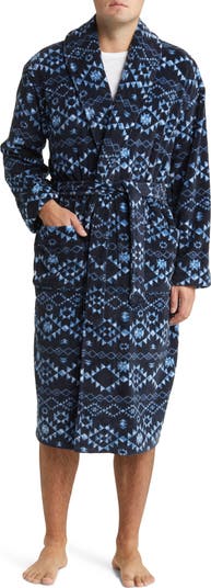 A geometric pattern of blue and white enlivens a robe made of plush fleece with a relaxed collar and longer length adding extra coziness on cold days.