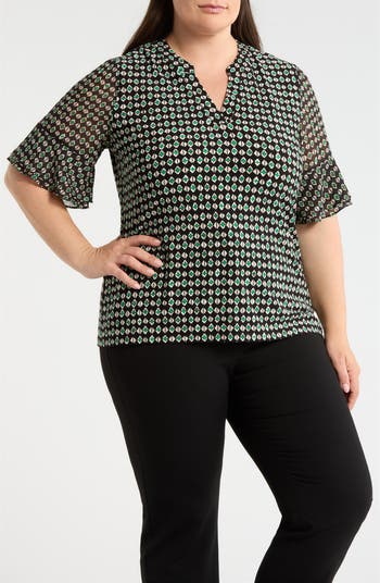 Ruffle cuffs add a bit of fanciful flutter to this casual knit top in a free-form geo pattern.