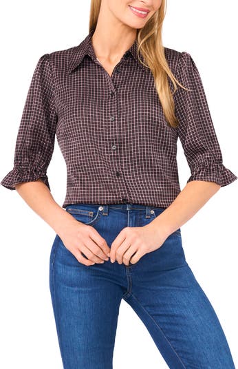 Puffed and gathered sleeves sweeten a satin button-up covered in a perky print.