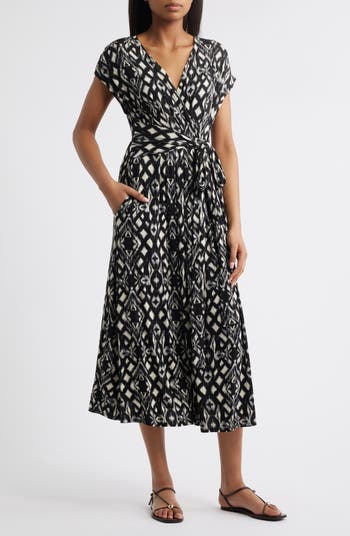 A bold geometric print covers this faux-wrap jersey dress designed with a gracefully wrapped bodice and cut to a beloved midi length.