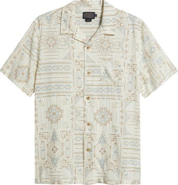 Sun-faded geometric patterns designed with subtle botanic accents invite cooling breezes in a camp shirt made in part with soft, lightweight linen. Perfect for enjoying relaxing afternoons and casual evenings, it's the perfect addition to your warm-weather wardrobe.