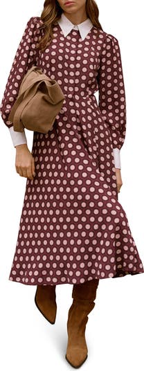 Burgundy tone geo print dress in a midi silhouette featuring a contrast classic collar, long sleeves, contrasting button cuffs, flare hemline with a concealed button fastening through the front.
