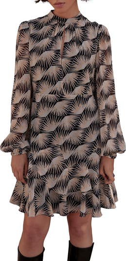 Geo print dress in a mini silhouette featuring a high neckline, long sleeves, elasticated cuffs, metallic gold fleck detailing, layered ruffle hemline and zip fastening through the back.