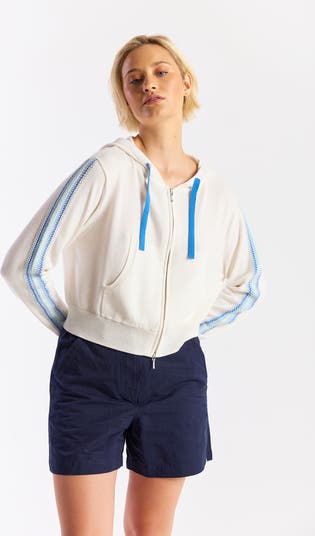 Cropped zip hoodie that sculpts a relaxed sporty silhouette, soft to the touch, geometric sleeve detailing adds modern edge for sunlit weekend escapes.