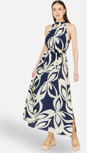 This elegant halter neck dress is designed to make a refined statement with minimal effort. Featuring a striking geo print, it brings a modern, graphic feel to summer styling. The high halter neckline creates a flattering, elongated silhouette, while the self-tie waist cinches the figure for a feminine shape. Finished with a flowing maxi-length skirt and a subtle side split for ease of movement, this dress is perfect for warm days, holidays, or dressed-up evening occasions.
