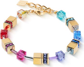 Bright, powerful, modern: This bracelet brings the entire colour spectrum of the rainbow to the wrist. The gold-coloured haematite cubes with a titanium oxide finish form the basis for a design that impresses with its intense colours and clear shapes. A highlight for anyone who wants to emphasise their style in a colourful yet sophisticated way.