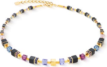 Classic design meets powerful colour accents: The GeoCUBE cubes in midnight blue, violet, ros and ice blue combine with deep black onyx and sparkling crystals to create a striking overall look. Fine, cuboid elements made from gold-finished haematite create elegant accents between the stones. Gently tapered at the back for optimum wearing comfort - a piece of jewellery with sophistication.