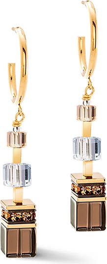 These hoop earrings with a fine pendant are a harmonious interplay of light, shape and colour. Warm cube elements made of smoky quartz and sparkling Swarovski crystals meet gold-coloured stainless steel and add an elegant touch to any look. Ideal for festive occasions - or as a gift that comes from the heart.