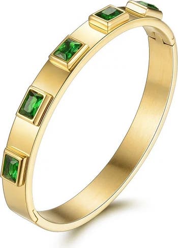 Turn heads with a touch of color and modern charm. The Mazin Jewels Geometric Bangle features striking green square-cut cubic zirconia stones set into a sleek, gold-tone design. The vivid green adds a pop of personality, while the geometric silhouette keeps it effortlessly contemporary. Whether you're dressing up your daywear or adding a unique touch to your evening look, this bangle brings bold elegance and standout sparkle to your stack.