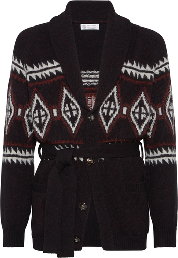 The classic feel of knitwear highlights the natural properties of the virgin wool, silk and cashmere fibers: the texture is both compact and lightweight, providing the garment with warmth and comfort. The typical mottled effect of the twisted yarn enhances the refined seasonal nuances, while Jacquard loom weaving creates a retro-inspired geometric motif.