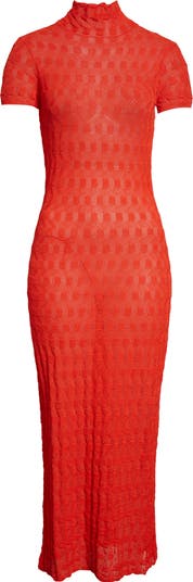 A geometric-inspired jacquard knit with airy pointelle stitching bring rich texture to this figure-hugging midi dress topped with a demure mock neck.