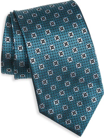 Polished geometric shapes pattern a sophisticated tie woven in Italy from fluid silk.