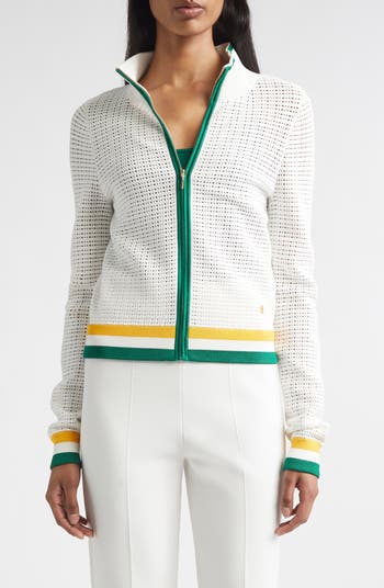 Ideal as a light layer for breezy weather, this open-knit jacket is styled with a contrast zipper placket and striped cuffs and hem.