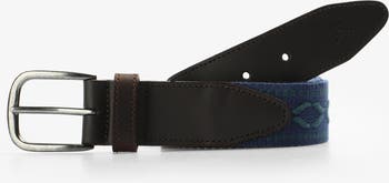 - Geometric patterned belt with leather details and metal buckle fastening