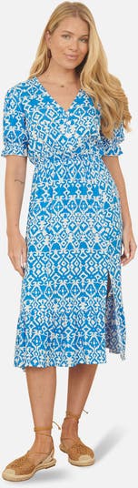 This cute summer dress is super stylish with lovely design details. With a ruched waist for a comfortable fit, puffed sleeves and a midi hemline that is finished with a split. The all over geo print is perfect for the sunshine, sipping cocktails at a BBQ or taking on holiday.