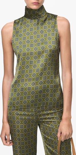An allover geo print enlivens this sleeveless top cut from rich satin for softness and sheen.
