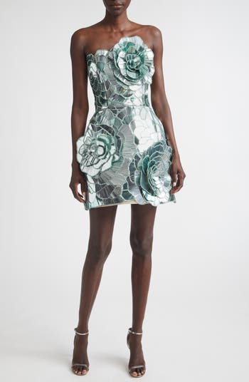 Meticulously layered geometric sequins shimmer with sculptural precision across beaded rosettes on this silk-lined minidress—each hand-shaped petal celebrating both the brand's devotion to botanical artistry and the beauty of nature in full bloom.