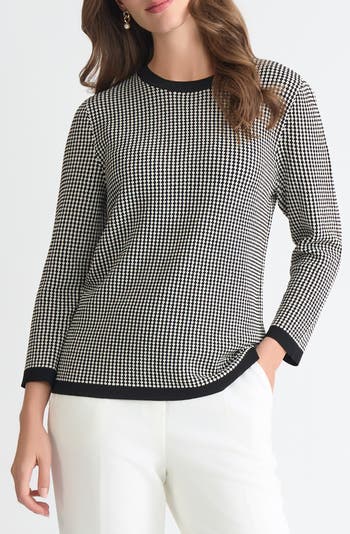 Build out your black-and-white collection with this intricately textured pullover sweater framed by a crewneck and three-quarter-length sleeves.
