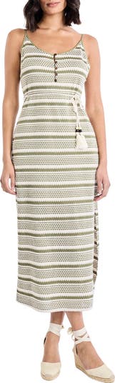 Geometric stitches enhance the resort-ready charm of this lightweight sweater-dress tethered by dainty straps and accented by a beaded tassel-tie belt.