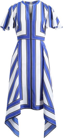 Bold geometric stripes enliven this flutter-sleeve dress designed with a flowy high-low handkerchief hem.