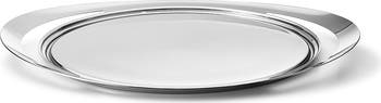 A fluid, serpentine profile distinctively shapes a serving tray shaped from stainless steel with a liquid-shine polish that makes a ripple in any table setting.