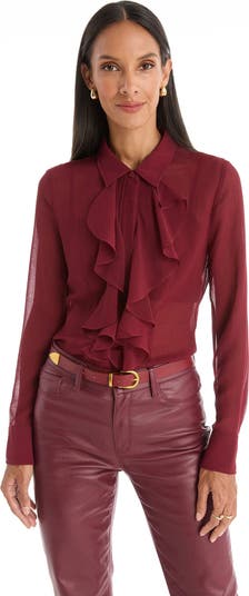 Romantic femininity meets modern tailoring - the Georgia Blouse is the incredible statement piece you've been searching for. Designed with front ruffle details dancing across a relaxed button-down, this top features a front-darting detail for a slimming effect. Perfect for layering, this dazzling style is a must-have.