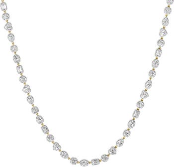 Mixed-shaped lab-grown diamonds sparkle in 18-karat gold settings all around this Georgian-inspired tennis necklace.