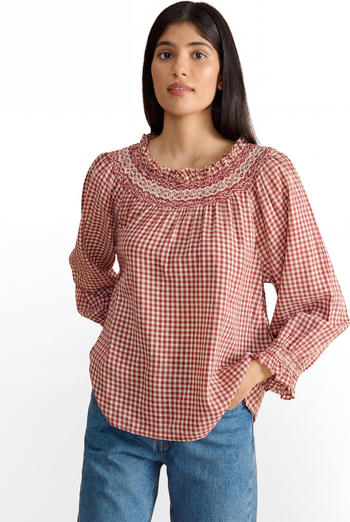 Soft and easy with thoughtful detail, Georgie is a cosy blouse in warm rust gingham. Made from brushed cotton twill, she features a gently smocked round neckline and smocked cuffs on her long sleeves. An everyday staple with a nostalgic charm.