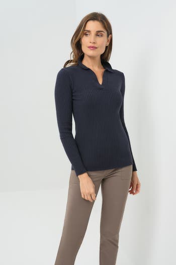The Georgie Rib Sweater Knit Collared Top is a refined fall essential, made from exceptionally soft ribbed fabric. Its sleek collared detail adds a subtle sophistication, turning this comfortable basic into a polished layer perfect for the season.